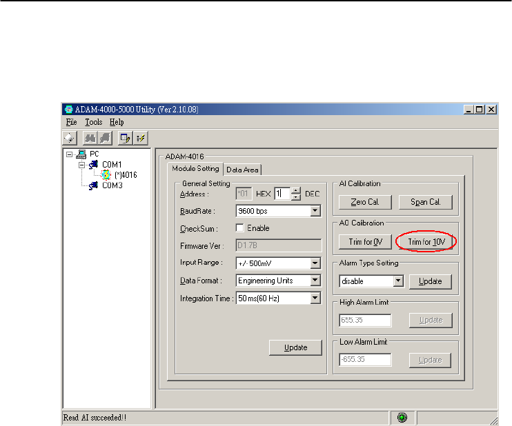 the ADAM utility software. (Please see "A/O 10 V Calibration"