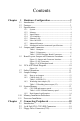 Contents Chapter 1 Hardware Configuration .................................2 1.1 1.2 1.3 Introduction ....................................................................... 2 Features ............................................................................. 3 Specifications .................................................................... 3 1.3.1 1.3.2 1.3.3 1.3.4 1.3.5 1.3.6 1.3.7 1.3.8 1.4 System............................................................................. 3 Memory.............