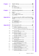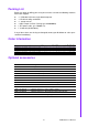 2.20 2.21 2.22 2.23 2.24 2.25 2.26 Chapter Chapter 3 Software Configuration .................... 19 3.1 3.2 Introduction ............................................................................................. 20 Connections to Standard LCDs .............................................................. 20 3.2.1 LG LM150X06 (1024x768(16 colors) LVDS LCD)...................... 20 Table 3.1: Connections to LCD/ Flat Panel (CN8) .................... 20 4 Award BIOS Setup .........................