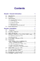 Contents Chapter 1 General Information 1.1 1.2 1.3 1.4 Introduction ....................................................................... 2 Features ............................................................................. 3 Specifications .................................................................... 4 1.3.1 Standard SBC functions .............................................. 4 1.3.2 VGA function .............................................................. 4 1.3.4 Ethernet function .......