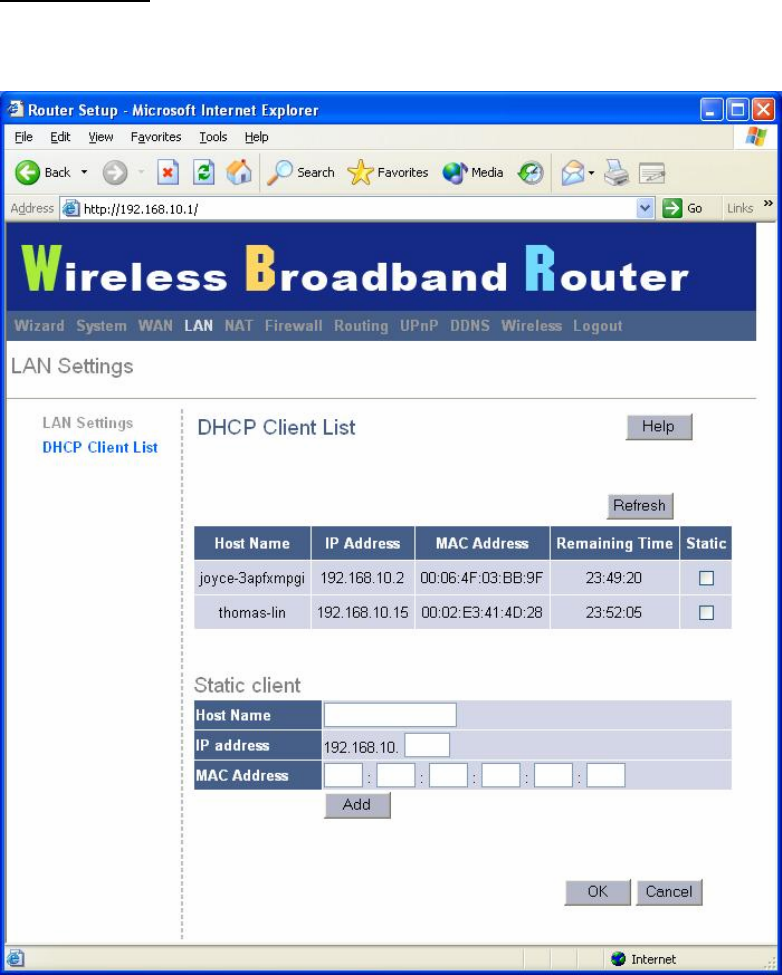 network. The “DHCP Client List” displays the IP address and the MAC address and Remaining
