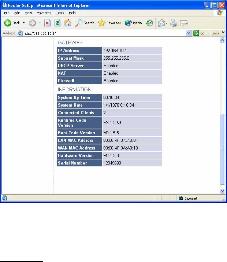 GATEWAY: Displays system IP settings, as well as DHCP, NAT and Firewall status.