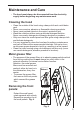 Maintenance and Care • The hood must always be disconnected from the electricity supply before beginning any maintenance work. Cleaning the hood • Clean the outside of the hood using a damp cloth and a mild detergent. • Never use corrosive, abrasive or flammable cleaning products. • Never insert pointed objects in the motor’s protective grid. • Wash the outside surfaces using a delicate detergent solution. Never use caustic detergents or abrasive brushes or powders.