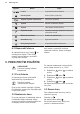 www.aeg.com Symbol / Názov Popis h / min Je spustená časová funkcia. Pachový filter Pachový filter je zapnutý. Teplota / Rýchle zohrievanie Funkcia je spustená. Teplota Zobrazí sa aktuálna teplota. Teplota Túto teplotu môžete zmeniť. Teplotná sonda Teplotná sonda je pripojená do zásuvky na teplotnú sondu. Blokovanie dvierok Dvierka sú zablokované. Osvetlenie rúry Vypli ste osvetlenie. Kuchynský časomer Je spustená funkcia časomera. 4.