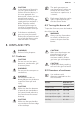 www.aeg.com Gas connection: R 1/2" Appliance class: 3 9.3 Bypass diameters BURNER Ø BYPASS 1/100 mm Triple Crown 56 Semi-rapid 32 Auxiliary 28 9.4 Gas burners for NATURAL GAS G20/G25 20/25 mbar (BE) G20 20 mbar (LU) BURNER NORMAL POWER kW MINIMUM POWER kW INJECTOR MARK 1/100 mm Triple Crown 3,8 1,4 146 Semi-rapid 1,9 0,45 96 Auxiliary 1,0 0,33 70 9.
