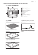 DANSK 3. PRODUKTBESKRIVELSE AF APPARATET 3.1 Oversigt over apparatet 1 8 2 3 4 5 6 4 3 2 1 1 2 3 4 5 6 7 8 Betjeningspanel Elektronisk programur Bøsning til termometer Varmeelement Ovnpære Blæser Ovnribber, udtagelige Rillepositioner 7 3.2 Tilbehør Trådrist Til kogegrej, kageforme, stege. Bageplade Til kager og lagkagebunde. Grill/bradepande Til bagning og stegning, eller som en drypbakke til opsamling af fedt. Termometer Bruges til at måle, hvor gennemstegt kødet er.