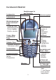 Kurzübersicht Mobilteil Rastöffnungen für den Gürtelclip Lautsprecher Antennensymbol Ladezustand Wahlwiederholung, Pause und Scroll Taste -Öffnen der Wahlwiederholungsliste -Pause eingeben -Scrollen vorwärts Menü - Einstellungen Mobilteil & Basis - Telefonbuch - Anmelden SMS Menü - Neue Nachrichten - Eingang - Ausgang - Konfiguration - Löschen - Benutzer Lösch- / Muteund EIN/AUS Taste Abheben-Taste - Gespräch annehmen - Rufnummer wählen Tastwahlblock Anruferliste und Scroll - Taste - Öffnen der An rufe