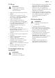 www.aeg.com 3.10 DYNAMICAIR-funktion 1. Tryk på Mode, indtil det tilsvarende symbol vises i displayet. DYNAMICAIR-indikatoren blinker. 2. Tryk på OK for at bekræfte. DYNAMICAIR-indikatoren vises. Funktionen slås fra ved at gentage proceduren, indtil DYNAMICAIRindikatoren slukkes. Aktiveringen af DYNAMICAIR-funktionen øger energiforbruget. Hvis funktionen aktiveres automatisk, vises DYNAMICAIR-indikatoren ikke (se "Daglig brug"). 4. DAGLIG BRUG ADVARSEL! Se kapitlerne om sikkerhed. 4.