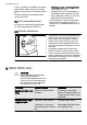 www.aeg.com Проблема Можлива причина Спосіб усунення Лампочка не сві‐ титься. Лампочка знаходиться в режимі очікування. Закрийте, а потім від‐ крийте дверцята. Лампочка несправна. Див. розділ «Заміна лам‐ почки». Настроєна неправильна температура. Встановіть вищу темпе‐ ратуру. Дверцята не зачинені належним чином. Див. розділ «Закривання дверцят». Дверцята відчинялися надто часто. Не тримайте дверцята відчиненими довше, ніж необхідно. Температура продуктів надто висока.