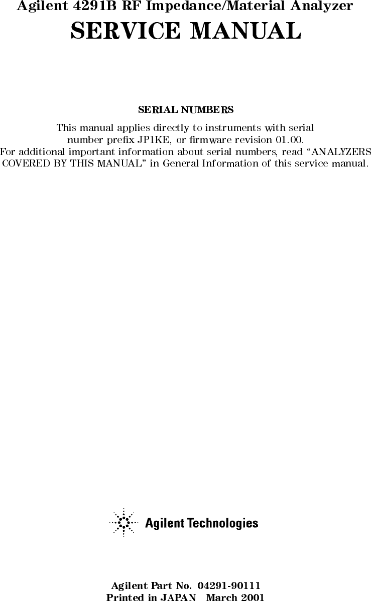 Agilent 4291B RF Impedance/Material Analyzer SERVICE MANUAL SERIAL NUMBERS This manual applies directly to instruments with serial number pre x JP1KE, or rmware revision 01.00. For additional important information about serial numbers, read \ANALYZERS COVERED BY THIS MANUAL" in General Information of this service manual. Agilent Part No.