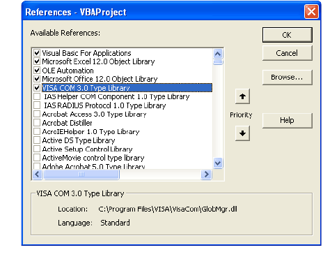 2 In the References dialog, check the "VISA COM 3.0 Type Library".