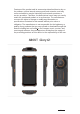 BASIC DESCRIPTION 1. Ejector hole ---Metal PIN hole to open the SIM/SD tray. 2. SIM/SD tray ---Supports Nano SIM and Micro SD card. 3. USB Type-C and Rubber Cover ---USB Type-C connector. 4. Sensor ---Optical proximity sensor and Ambient light sensor. 5. Receiver ---Waterproof receiver. Do not touch with hard pin. 6. Camera key ---Long press to quickly activate the camera. Short press to take a photo or video when camera is on 7. Display ---5.7inch display. 8.