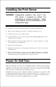 Installing the Print Server WARNING: Configuration problems may result if the Print Server is powered up without first establishing its network connection. Follow this procedure to avoid complications at the configuration stage. 1. Confirm proper operation of each of the printers to be connected to the Print Server. 2. When you have confirmed proper operation of each printer, switch its power off. 3. Confirm that your network is operating normally. 4.