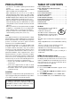 PRECAUTIONS TABLE OF CONTENTS • Use only in a 12-volt DC negative-ground electrical system. • Disconnect the vehicle’s negative battery terminal while mounting and connecting the unit. • When replacing the fuse, be sure to use one with an identical amperage rating. Using a fuse with a higher amperage rating may cause serious damage to the unit. • Do NOT attempt to disassemble the unit. Laser beams from the optical pickup are dangerous to the eyes.
