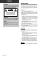 ENGLISH PRECAUTIONS WARNING TO REDUCE THE RISK OF FIRE OR ELECTRIC SHOCK, DO NOT EXPOSE THIS APPLIANCE TO RAIN OR MOISTURE. RISK OF ELECTRIC SHOCK DO NOT OPEN “CAUTION: TO REDUCE THE RISK OF ELECTRIC SHOCK, DO NOT REMOVE COVER (OR BACK). NO USER-SERVICEABLE PARTS INSIDE. REFER SERVICING TO QUALIFIED SERVICE PERSONNEL.” OBSERVERA Så länge som apparaten är ansluten till nätet flyter en svag ström genom densamma, även då den är avstängd.