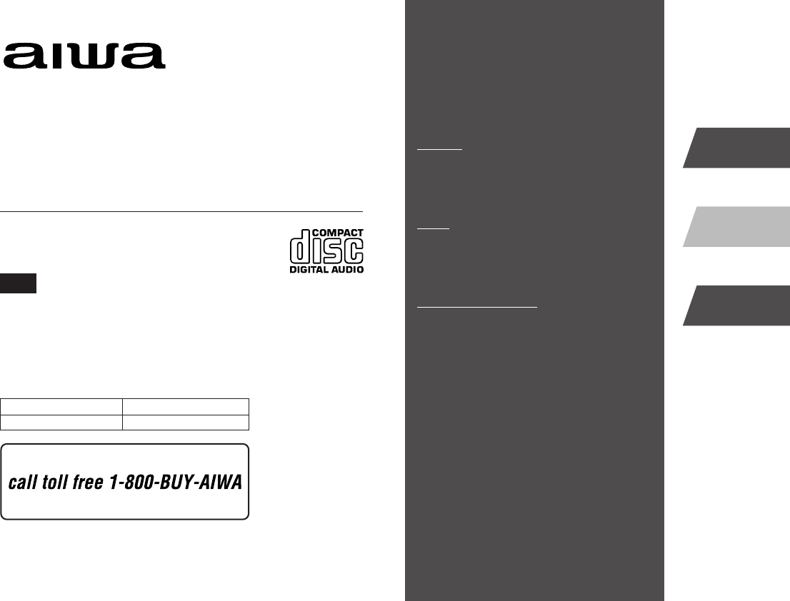 CD Stereo System XR-EM30 OPERATING INSTRUCTIONS En (English) MANUAL DE INSTRUCCIONES E (Español) MODE D'EMPLOI F (Français) U Owner’s record For your convenience, record the model number and serial number (you will find them on the rear of your set) in the space provided below. Please refer to them when you contact your Aiwa dealer in case of difficulty. Model No. Serial No. (Lot No.