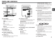 PARTS AND CONTROLS Main unit f/r, t/g (TUNING -, +) CD: skips to a previous or a succeeding track when pressed, searches a track in fast forward or reverse playback when held down. Radio: manually tunes up or down within the band. 6 1 7 0 ! 2 @ # 3 8 4 5 9 1 ECO/DIMMER Selects ECO mode and dimmer mode. TONE Adjusts the bass or treble level. SET Determines the mode. Stores the received station to preset. DISPLAY Changes the display in CD playback mode.