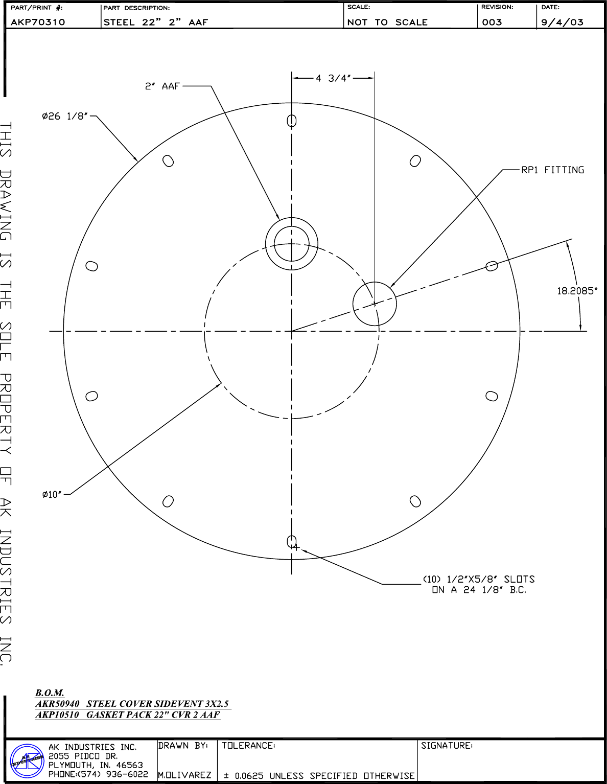 REVISION: DATE: 003 9/4/03 PART/PRINT &: PART DESCRIPTION: SCALE: AKP70310 STEEL 22" 2" AAF NOT TO SCALE RP1 FITTING 18.2085° 10> SLOTS ON A 24 1/8" BC. ‘INI SHENANIGAN MV 40 Alderman 3710S FHL SI ATHENIAN SILL BOM. AKR50940 STEEL COVER SIDE VENT 3X2.5 AKP10510 GASKET PACK 22" CVR 2 AAF 2055 PICOT DR. PLYMOUTH, IN. 46563 @ AK INDUSTRIES INC. WARN BY: | TOLERANCE: SIGNATURE! PHONINESS) 936-6022 BOLIVARES | + 0.