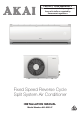 Technical Specifications AK-9000-F Fixed Speed Reverse Cycle Split System Air Conditioner Cooling Rated Capacity Rating Plate Parameters Heating 2500W Dehumidifying 0.8kg/h Rated Power Consumption Cooling 680W Heating 650W Rated Running Current Cooling 3.00A Heating 2.80A Max. Input Power 1000W Max. Input Current 5A EER Cooling 3.82W/W COP Heating 4.00W/W Power Supply Source 220-240V / 1Ph / 50Hz Refrigerant R410A Refrigerant Charged 1240g Max. Discharge Pressure 4.15MPa Max.