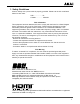Items (press ▲/▼ button) Brightness Contrast Saturation Phase Frequency Adjust (press ◄/► button) Decrease / Increase Decrease / Increase Decrease / Increase Decrease / Increase Choose Normal, Sharp or Sharpest Decrease / Increase Picture Mode Choose Color Temp Choose Peaking - Adjust Effects Darken / Brighten Reduce / Enhance Only for YPbPr 1 and YPbPr 2 Only for VGA Only for YPbPr 1, YPbPr 2 and HDMI Reduce to left / Widen to right Choose Normal, Bright, Cinema or User Choose Warm, Normal or Cool