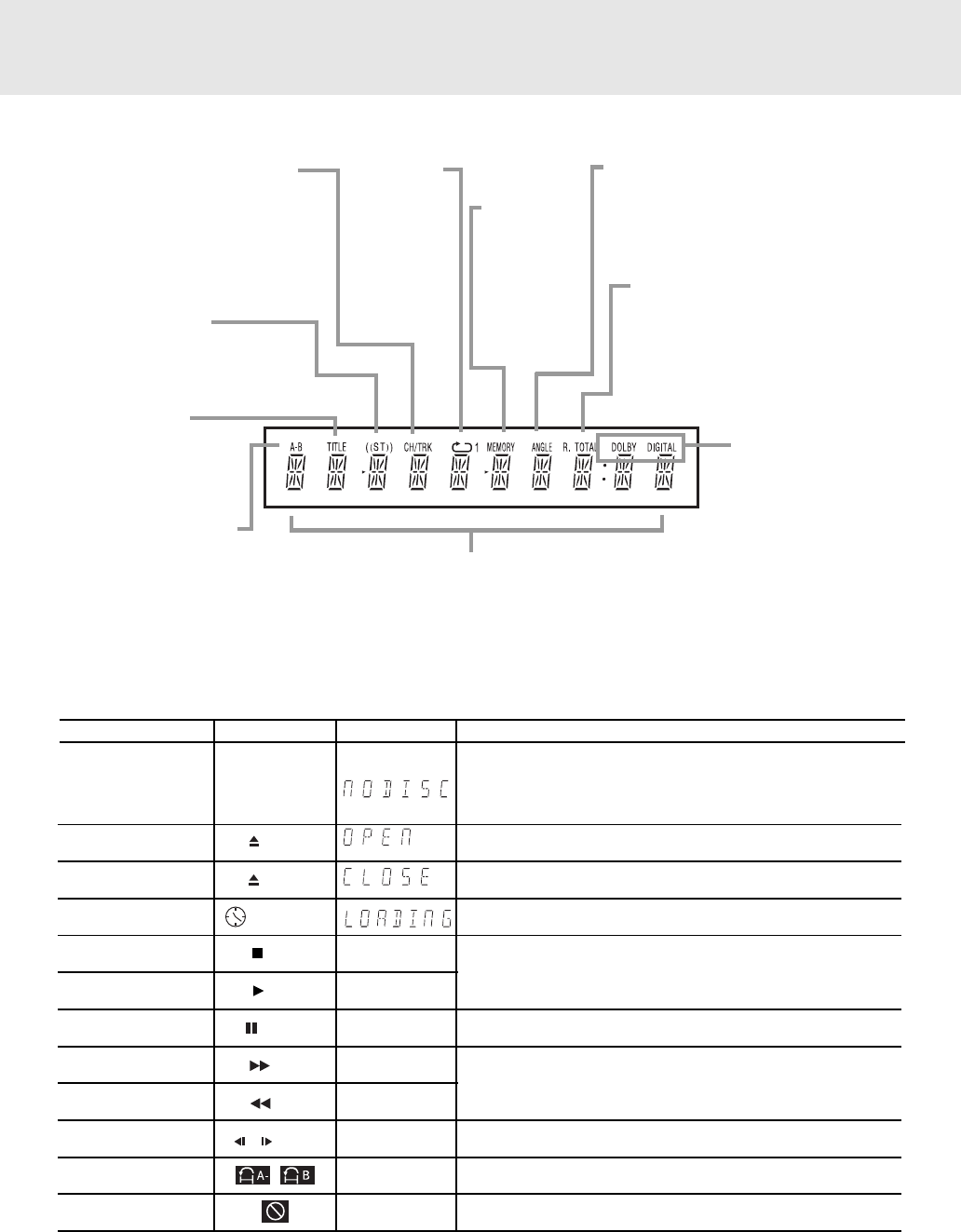 The DVD displays the information shown below on the TV screen and on the Unit's DVD display depending on the