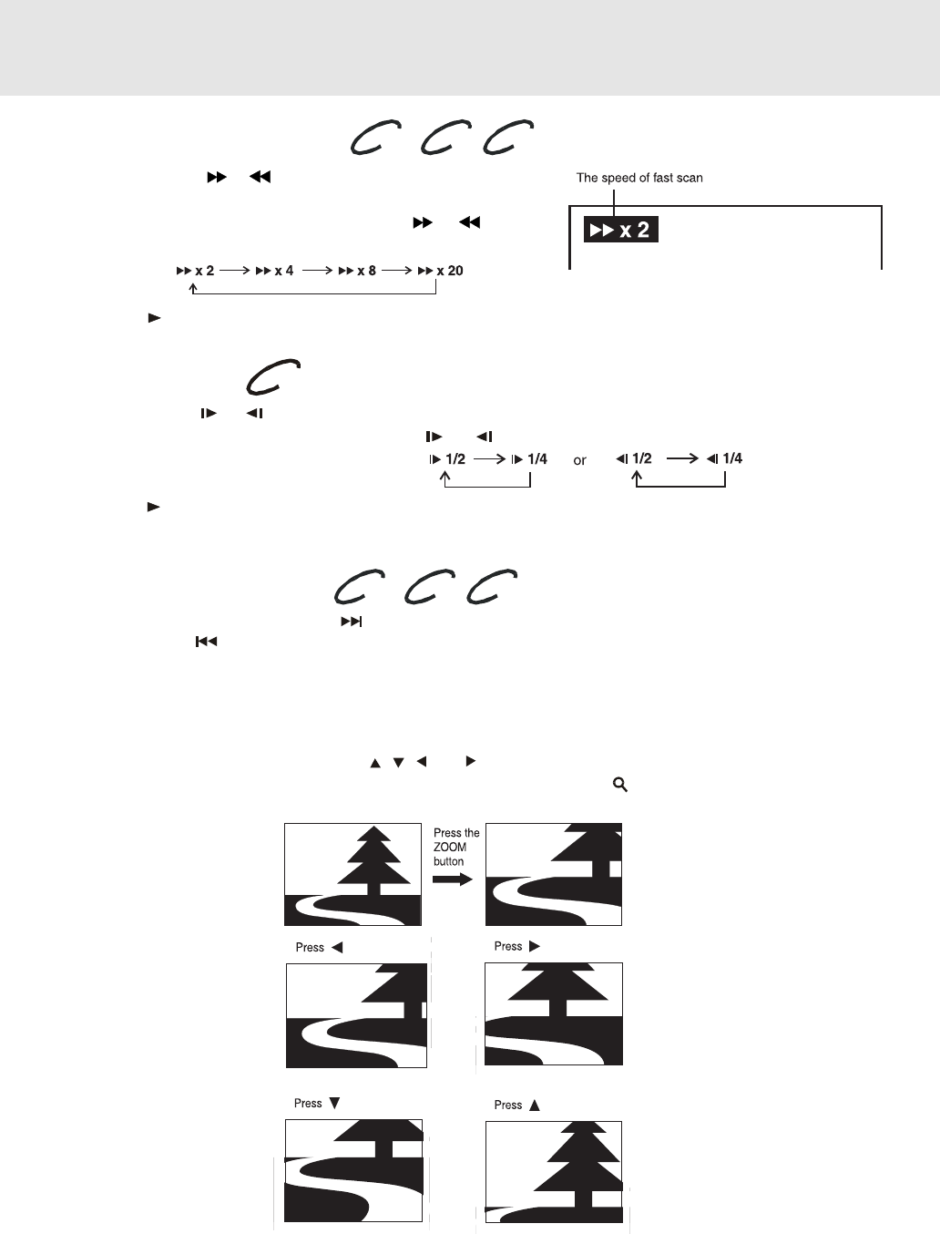 • Two speeds are available. Each time SLOW or SLOW button is pressed, the speed of slow-motion
