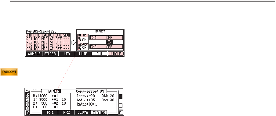 FX: Select the effect applied to a pad: 'OFF', 'FX1' or