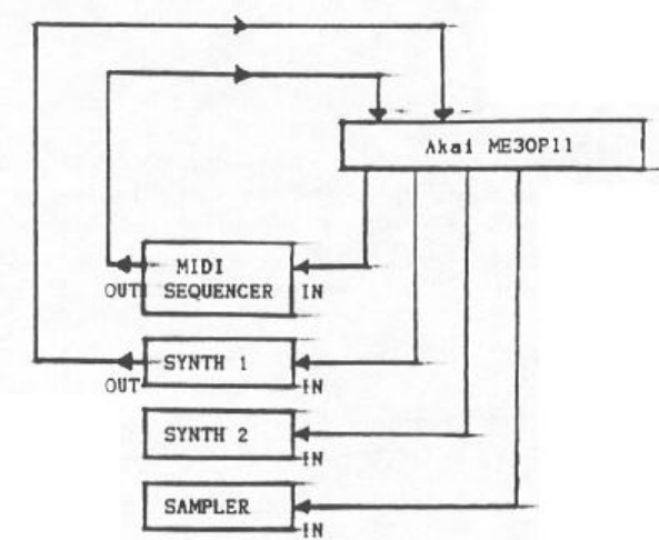 FIG. 2b Connecting a MIDI sequences to MIDI synths using the Akal ME30PIl