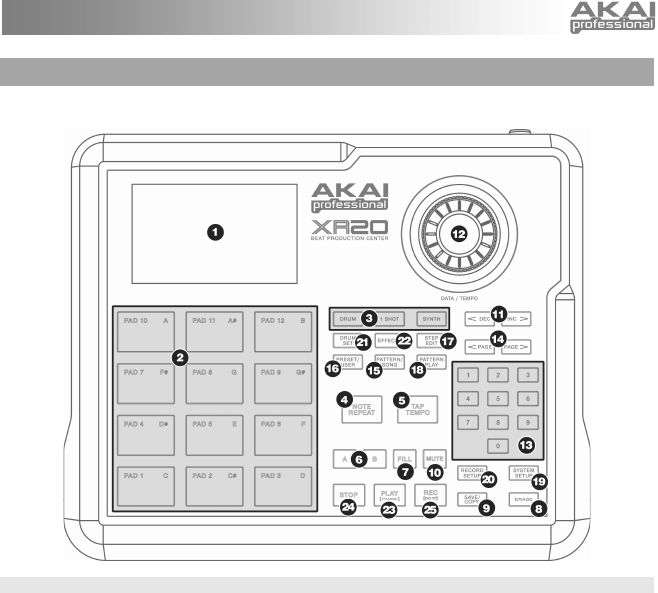 2. PADS – Los 12 pads se usan para disparar sonidos en el XR20. Los pads pueden admitir 3 tipos