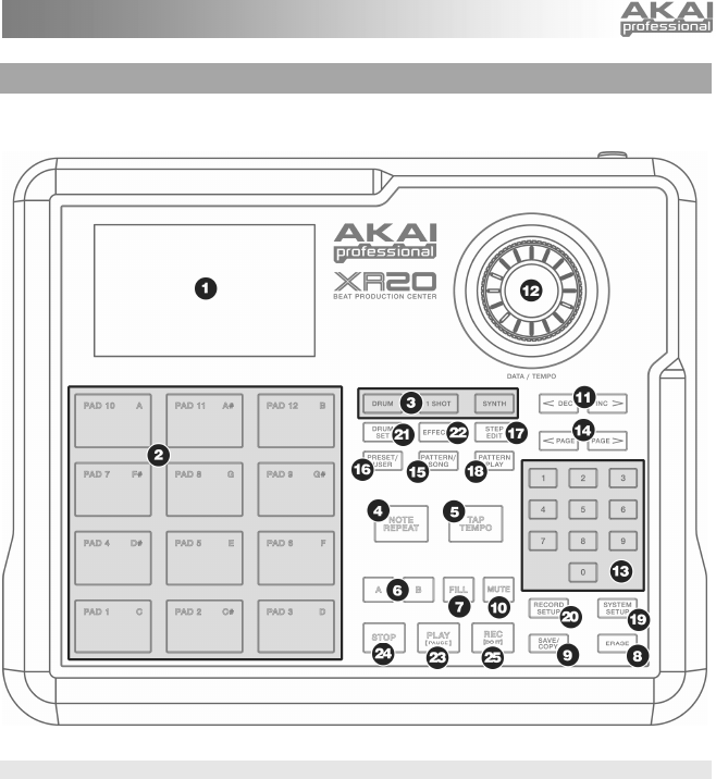 2. PADS – The 12 pads are used to trigger sounds on the XR20. The pads can address 3 different