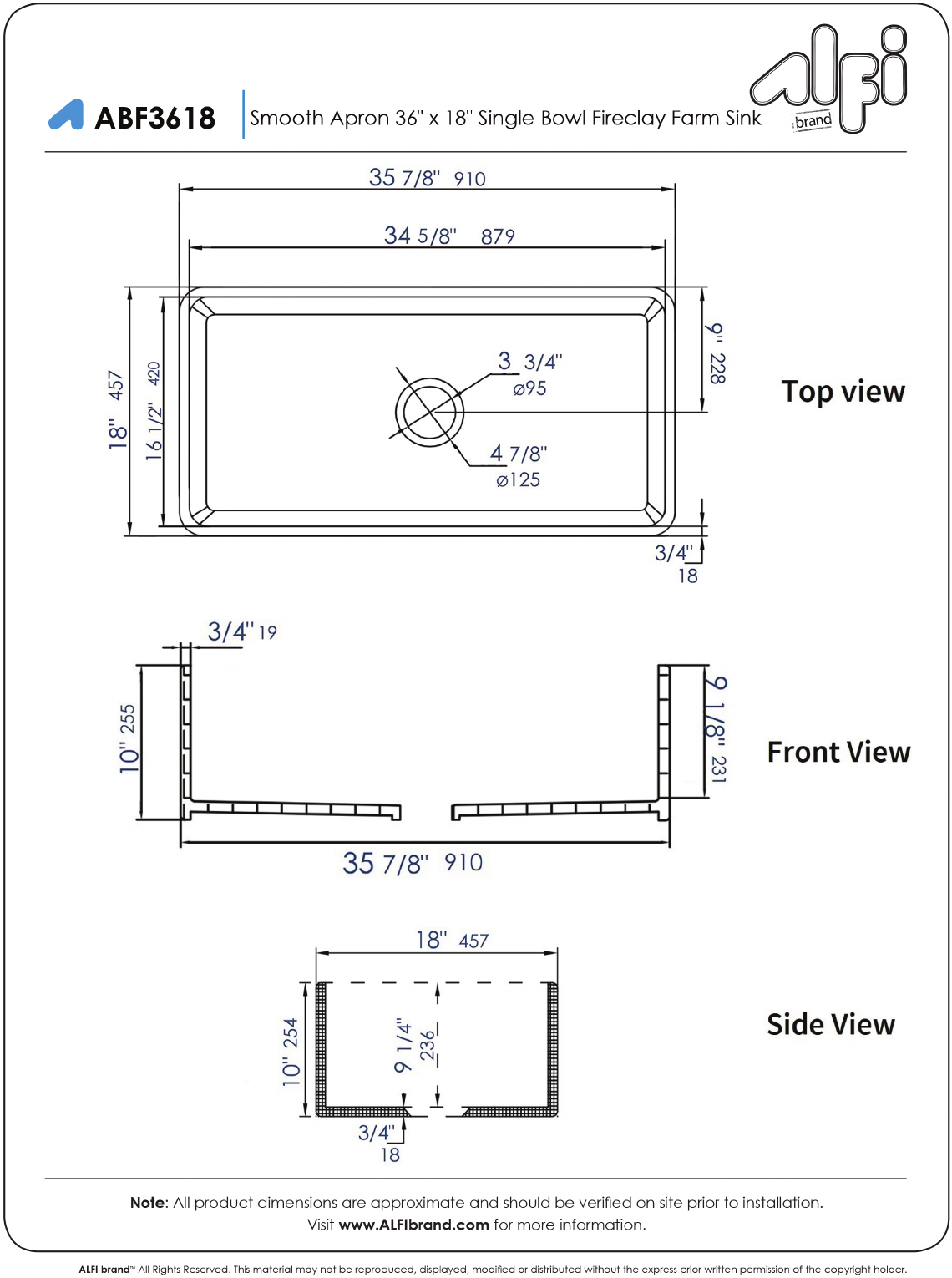 ABF3618-BM Smooth Apron 36" x 18" Single Bowl Fireclay Farm Sink in Black Matte Color