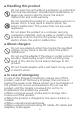 ■ Handling this product Do not open the unit without permission or instruction from the manufacturer. Unauthorized modification or repair may result in electric shock, fire and/or malfunction and voids warranty. Do not operate this product in a wet place such as in a shower room. It may result in electric shock, fire and/or malfunction. This product has not any water registance. Do not place the product in a container carrying conductive materials, such as water or metal in close proximity.