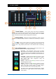 8. Operating Qu-Pac 8.1 Mixing using the Front Panel Controls 7 1 3 4 2 6 5 1 Select a channel - Press a Custom Sel key or touch a select button in the Channel screen to select a channel for editing. 2 Channel screen - Select any channel for editing, and adjust its fader and send levels using the ‘virtual fader strip’ and screen rotary control. Any Qu channel, FX or master can be accessed using the tabs in this screen.