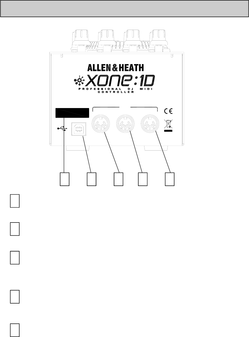 5-pin DIN style socket for connecting other MIDI devices through the Xone:1D. The
