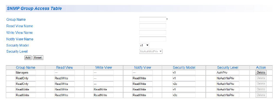 Figure 73. SNMP Group Access Table Example for SNMPv3