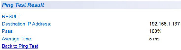 6. Click Back to Ping Test to return to the Ping Test Configuration Page.
