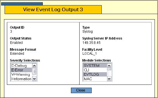For definitions of the parameters, refer to “Configuring a Syslog Output