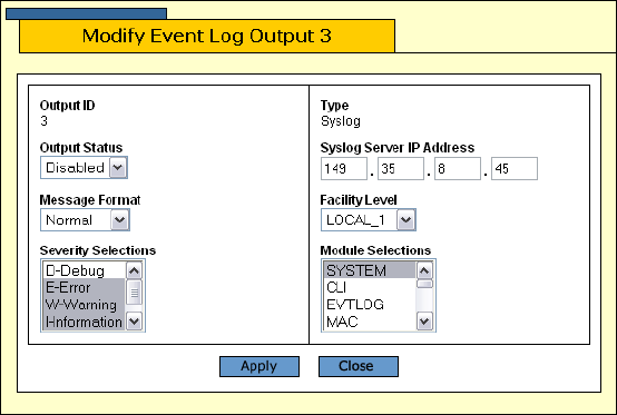 Figure 39. Modify Event Log Output Page