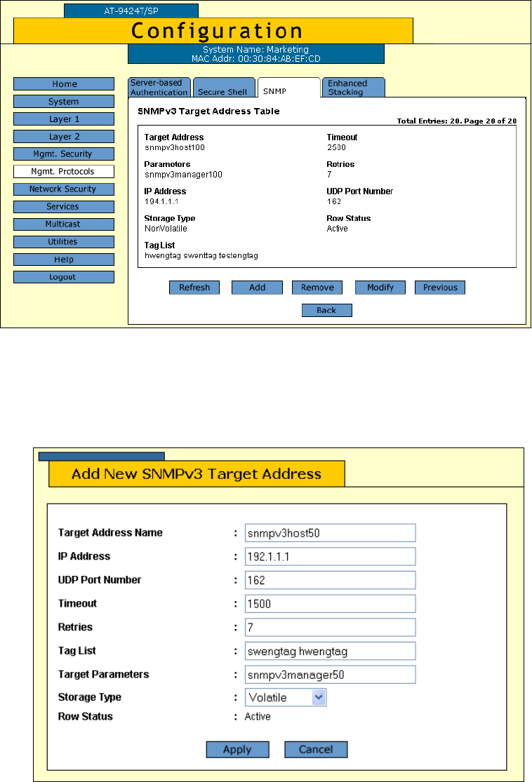 Figure 91. SNMPv3 Target Address Table Tab (Configuration)