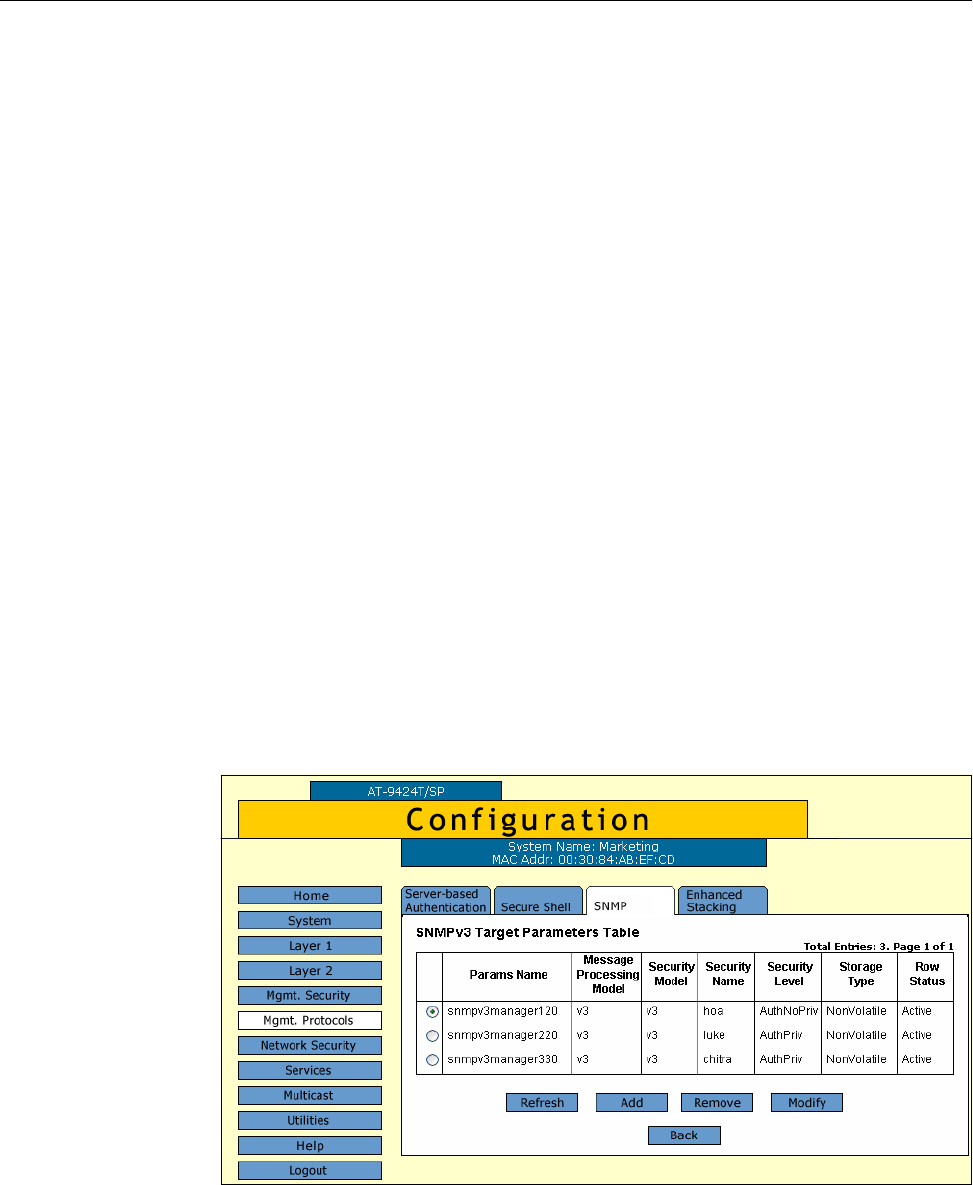 see Chapter 21, “SNMPv3” in the AT-S63 Management Software Menus