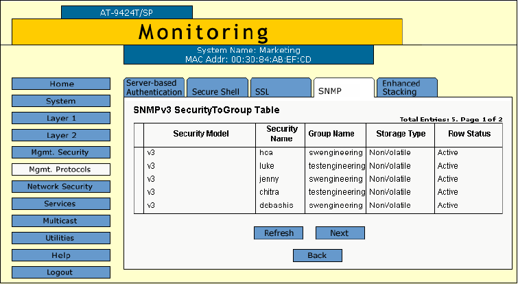 Figure 104. SNMPv3 SecurityToGroup Table Tab (Monitoring)