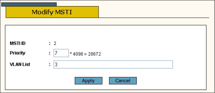 7. To change the MSTI’s priority value, enter a value in the Priority field.