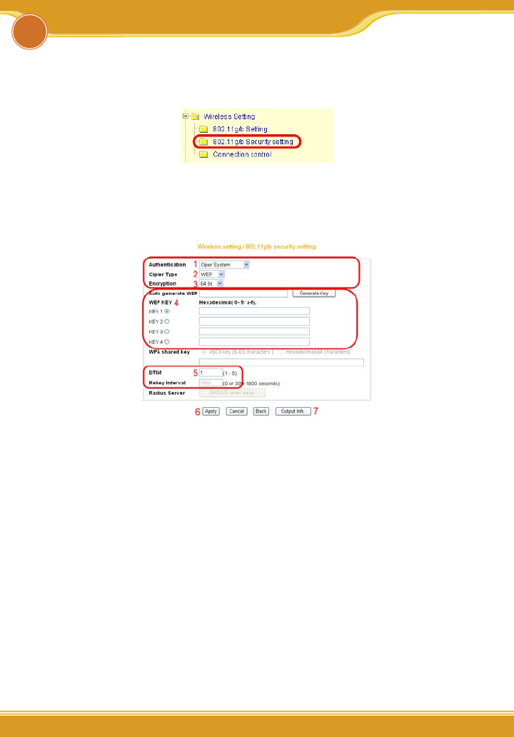 [802.11g/b Security setting] item. And select WEP or WPA setting.