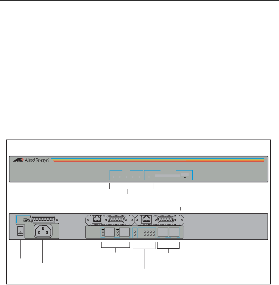 The AT-AR725 router’s front and rear panels (with a PIC installed in each PIC