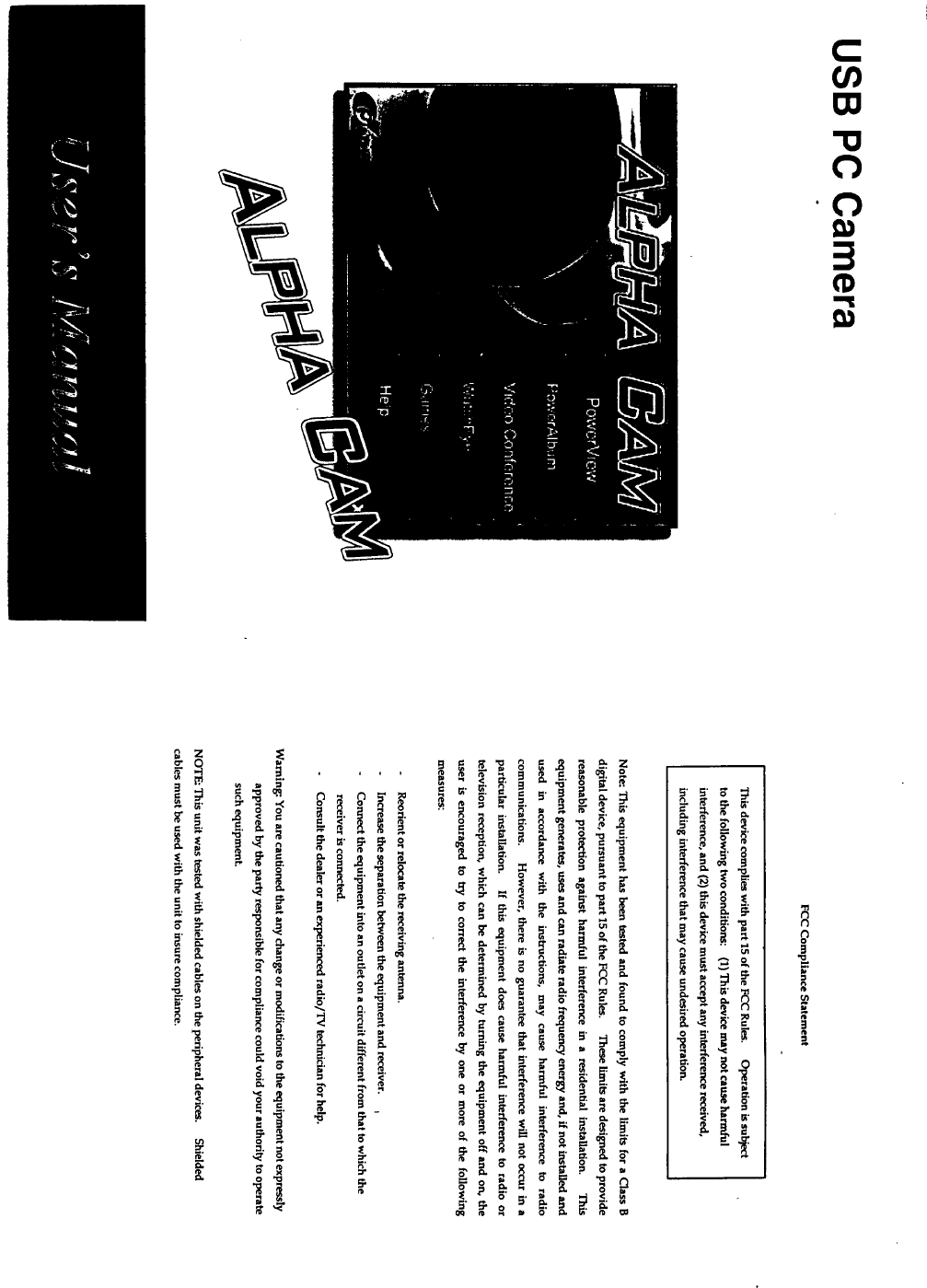 Alpha Cam IRE System Requirements, Packing Contents Installation Guide Sahel Power View Net Meeting Power Album Watch Eye Game MINIMUM SYSTEM REQUIREMENTS USB Port Pentium Processor 200M: (MMX Recommended) 32M Memory (64M Recommended) Windows 98 / 2000 800 x 600 Resolution (1024 = 768 Resolution Recommended) CD-ROM LAN or 33.6k Modem Sound Blaster or Compatible Sound Blaster Card Speaker and Microphone PACKING CONTENTS 1.Hardware Cameras Software CO Users Manual 2.