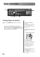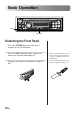 Basic Operation RLS POWER Detaching the Front Panel Press the POWER button for more than 3 seconds to turn off the power. Press the RLS (Release) button at lower left corner until the front panel pops out. Grasp the left side of the front panel and pull it out. 6-EN • The front panel may become hot in normal usage (especially the connector terminals), this is not malfunction. • To protect the front panel, place it in the supplied carrying case.