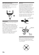 Installation Location Make sure the CDA-7990 will not be installed in a location subjected to: • Direct sun and heat • High humidity and water • Excessive dust • Excessive vibrations Handling the Detachable Front Panel • Do not expose to rain or water. • Do not drop or apply shock. Disc Cleaning Fingerprints, dust, or soil on the surface of the disc could cause the CD player to skip. For routine cleaning, wipe the playing surface with a clean, soft cloth from the center of the disc to the outer edge.