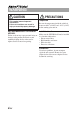 WARNING CAUTION PRECAUTIONS This symbol means important instructions. Failure to heed them can result in injury or material property damage. Temperature Be sure the temperature inside the vehicle is between +60Β°C (+140Β°F) and β10Β°C (+14Β°F) before turning your unit on. HALT USE IMMEDIATELY IF A PROBLEM APPEARS. Failure to do so may cause personal injury or damage to the product. Return it to your authorized Alpine dealer or the nearest Alpine Service Center for repairing.