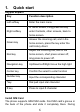 1. Quick start Keypad Explain Key Function description Left softkey Enter the main menu In home screen, Long press the key Right softkey enter Contacts, other screens, back to home screen. Answer the incoming call, and in the Green key home screen, press the key enter the call history direct. Reject the incoming call, and in the Red key home screen, short press screen off, long press to power off.
