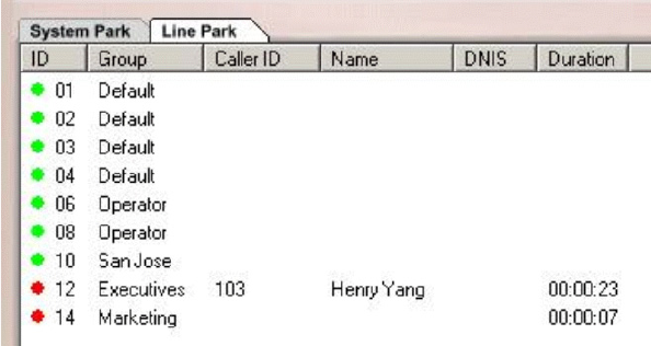 panel. In the Line Park panel, each line displays the Group, Caller ID, Line